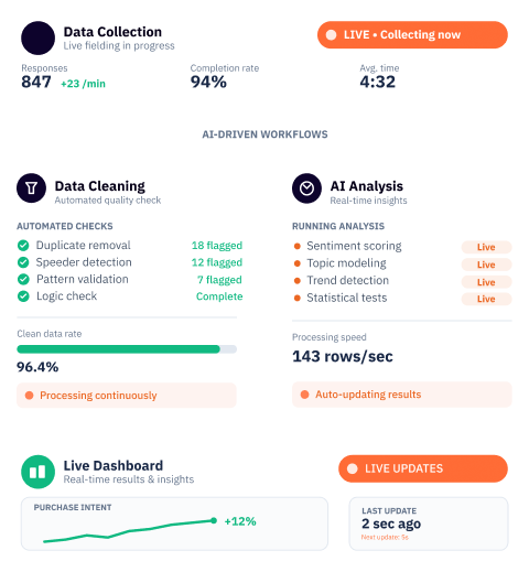 Validated consumer panels with demographic and behavioral controls. AI rebalances samples in real time for consistent representation.