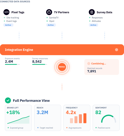 Link awareness, perception, and intent metrics to actual campaign exposure. Understand how creative, placement, and frequency shape brand and business performance.